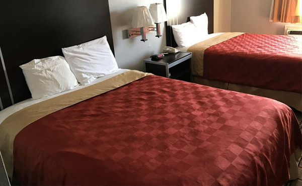 Smoking room with two queen beds. Amenities include: private bathroom, free Wi-Fi access, work desk, air conditioning, iron, heating, hairdryer, cable with flat screen TV, refrigerator, microwave and alarm clock.